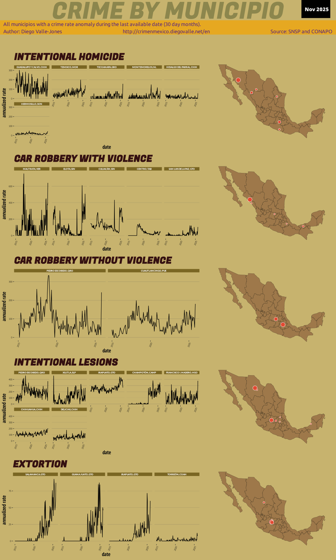 Each month the Secretariado Ejecutivo del Sistema Nacional de Seguridad Pública publishes information on crimes known to the police across all of Mexico on its website in the form of pdf tables and Excel files. This website downloads, processes the data, merges it with population data, and presents it as easy to interpret crime rates.