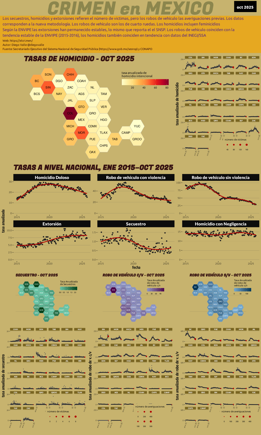 Cada mes el Secretariado Ejecutivo del Sistema Nacional de Seguridad Pública publica la información de incidencia delictiva que le remiten las procuradurías estatales en su sitio web. Junto con las cifras de homicidio del Instituto Nacional de Geografía y Estadística (INEGI) estos son los principales instrumentos para medir la magnitud del fenómeno de la inseguridad en México. Este sitio descarga, procesa y presenta los datos de una manera fácil de interpretar.