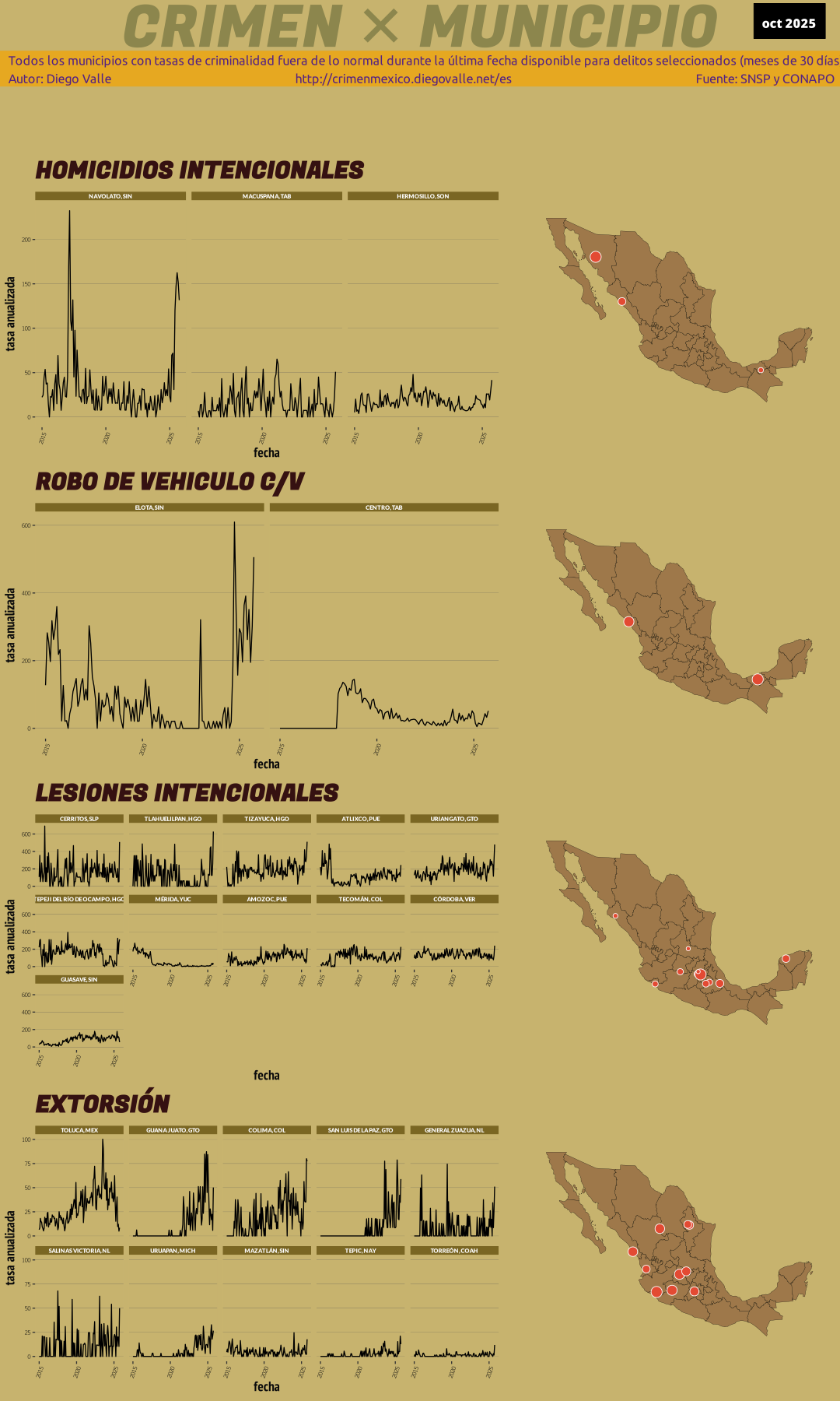 Identificar municipios con aumentos inusuales en los niveles de crimen debería ser una estrategia central del gobierno para combatir la violencia. Este sitio web facilita el monitoreo de esos municipios donde el crimen se disparó, con la esperanza de que eventualmente las autoridades hagan algo al respecto (LOL).